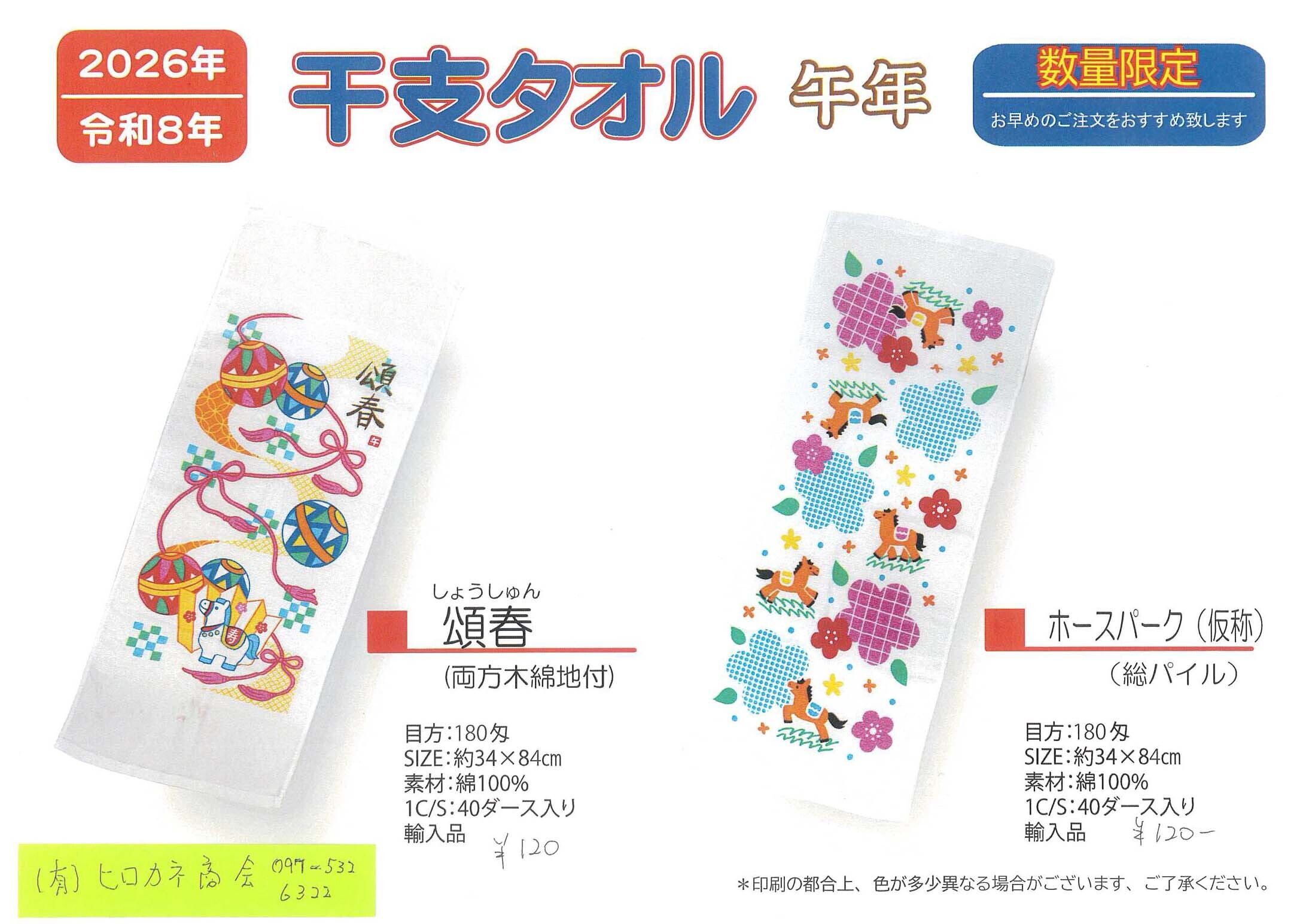 2026年版(令和8年版)干支タオルが発売となりました。タイミングにもよりますが1本(¥140)からお取寄せ可能です、数量限定品ですので使用の予定のある方は早めのお取り置きをお願いします。まずはお問合せをお待ちしております。